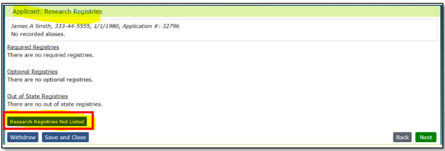 The employer has an option to search registries not listed on the screen. To search a registry that is not listed on the screen, click the Research Registries Not Listed button.