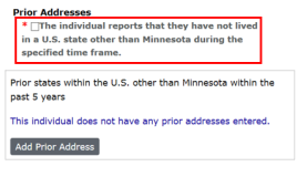 If the candidate has not resided in any state other than Minnesota in the past five years, leaving the section for prior addresses empty, check the box confirming that no prior out-of-state addresses were reported by the candidate.