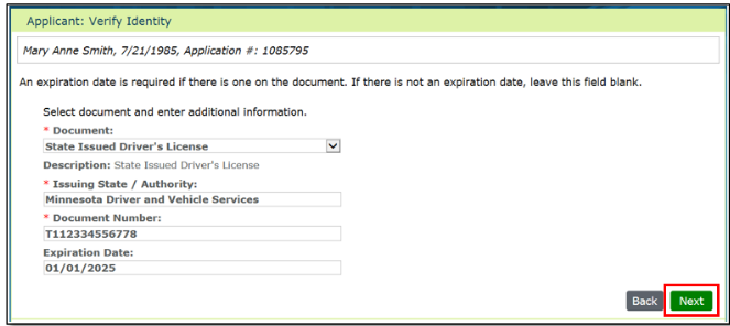 The fields will auto-populate with the information the candidate has provided. If all fields are complete, select Next.