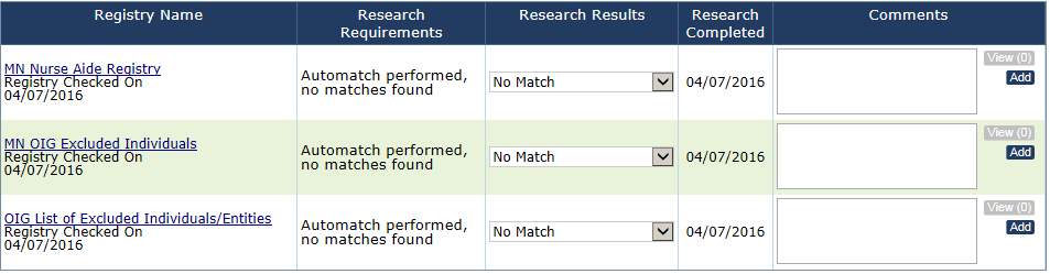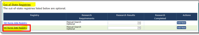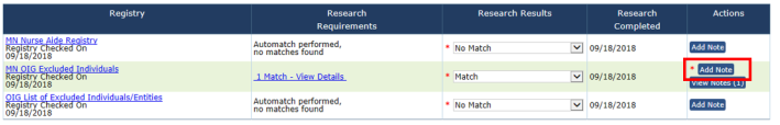 - You must add a note when a possible match is identified in the Research Results drop down, regardless of the selection you make. To add a note, click the Add Note button for that registry.