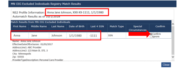 If A Match result box appears, compare the information provided with the candidate information to determine if the match is of the applying candidate. If it’s identified that the match belongs to the subject candidate, click the Confirm box in the Confirm column.