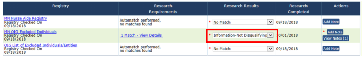 Select Information Not Disqualifying in the Research Results drop-down box for that registry.
