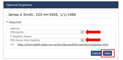 When the Optional Registries box displays, select the state in the Agency drop down, and the registry that you would like to search in the Registry Name drop down. Then click Save.
