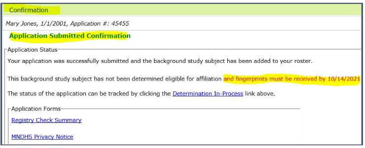 Scenario A: If the Determination is In-Process and fingerprinting is required: The candidate’s fingerprint deadline will display on the screen. The deadline date is calculated by the date the first background study was submitted. The candidate must be fingerprinted before the deadline date or the application will be closed.