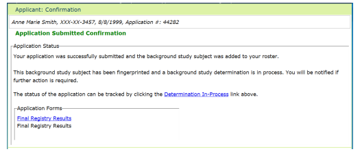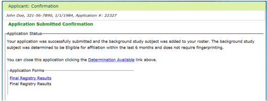 - The Application Confirmation page will generate. This page confirms that the background study was successfully submitted and the study subject automatically shows as affiliated on Adara Home Health roster. The determination status and next steps needed (if any) will display as in scenarios A, B, and C below.