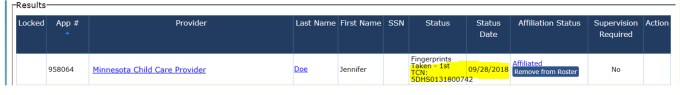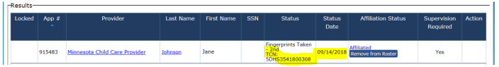 - Identify the fingerprinting status (if fingerprinting was required for the candidate). The Status column identifies when candidate was fingerprinted. The Status Date column displays the date that the determination status was updated.