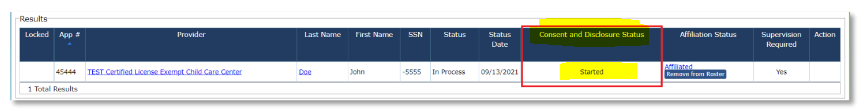 - The employer tracks the status of the consent and disclosure using the Consent and Disclosure Status column. This column will display for entities to review whether the study subject completed the consent.