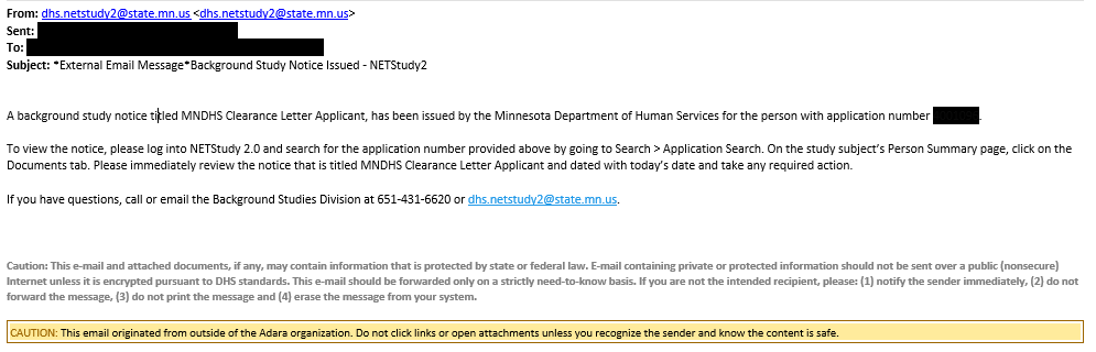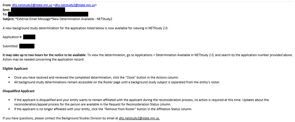When a candidate’s background study determination is available, the employer will receive an email notification with the subject line “New Determination Available – NETStudy2” as in the example below: