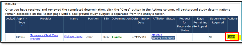 - If the employer is proceeding with hiring of the candidate, the employer must acknowledge the background study determination by closing the application record from the Determination Available queue.