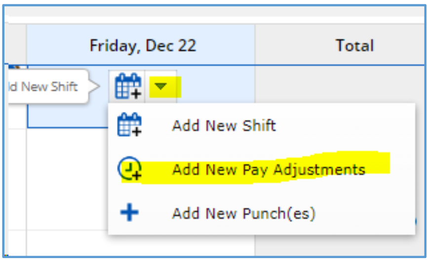 - After selecting a day within that employee’s week, select the arrow beside the icon shown and choose Add New Pay Adjustments from the dropdown.